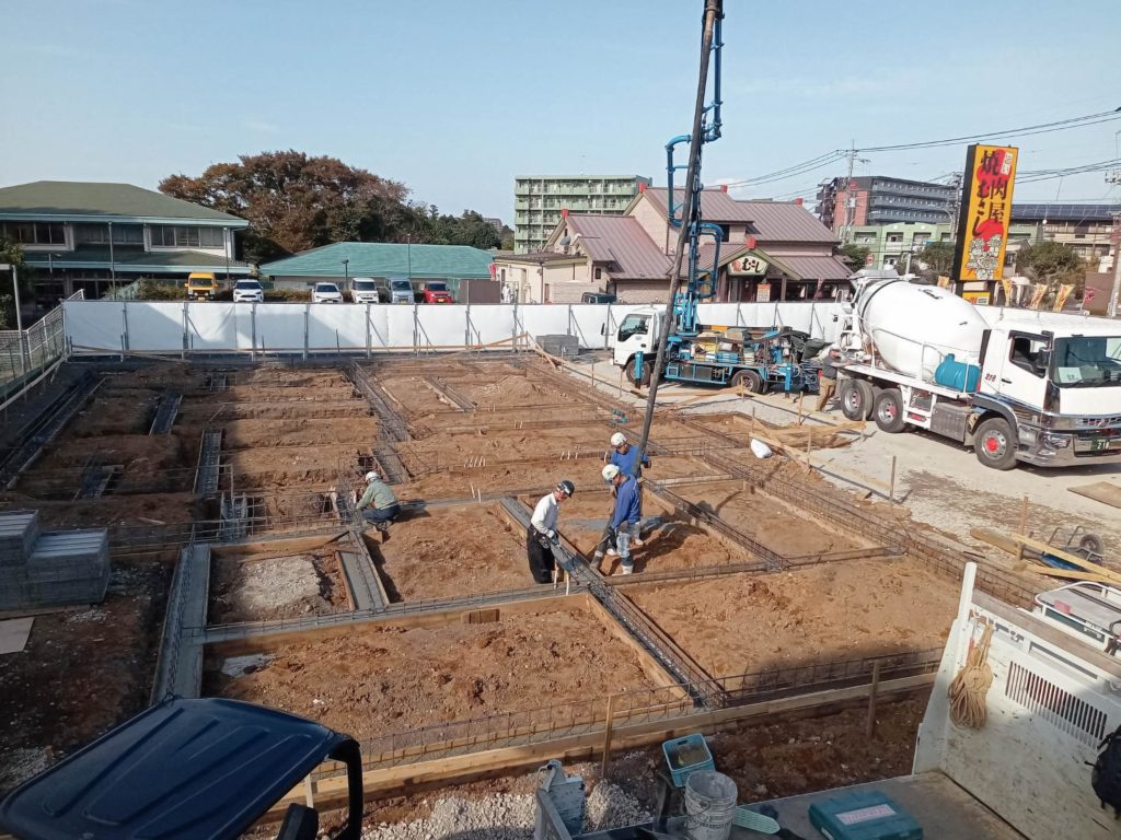 本日、基礎ベースコンクリート打設工事を行っております。