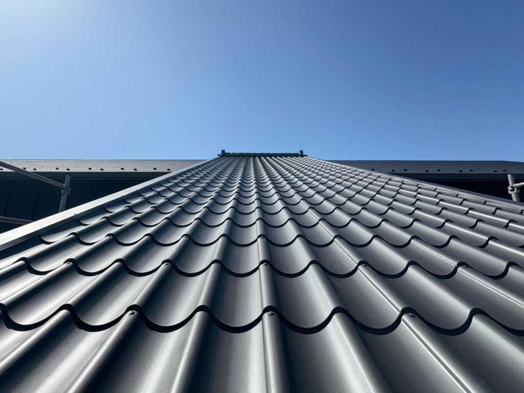 モダンな金属瓦。非常に軽量で高耐久、見た目や質感もご覧の通り美しいです。
